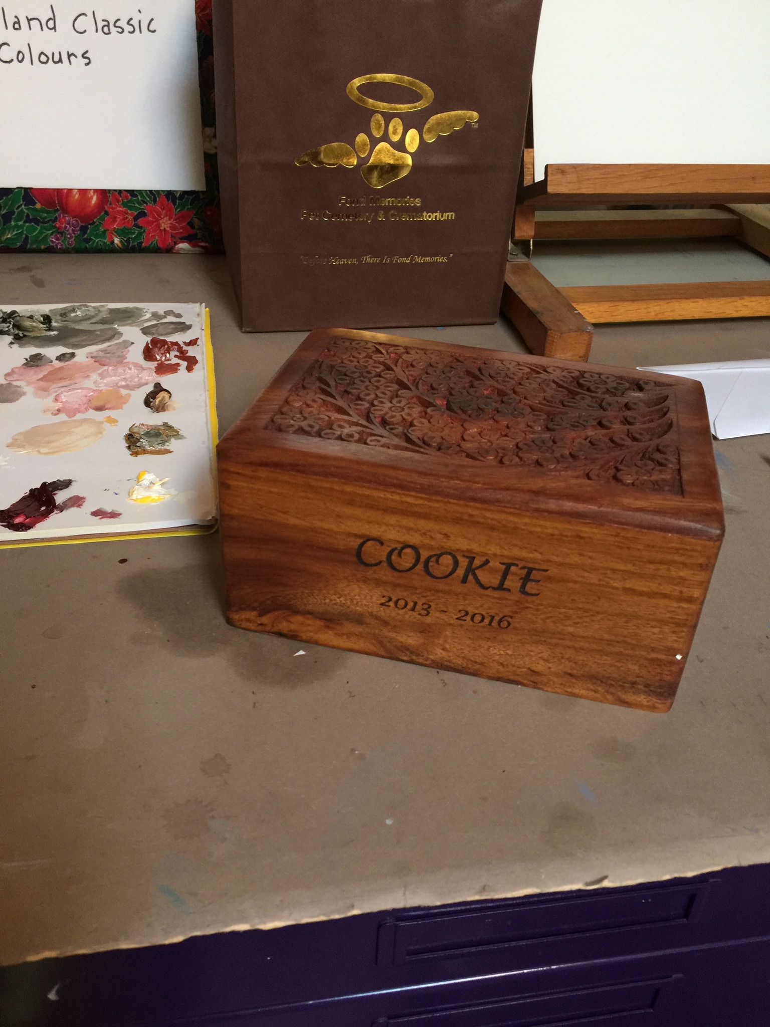 Cookie’s ashes. She died suddenly at the vet’s during a routine physical. Chaga’s Disease — a parasite that attacks the heart, introduced by the bite of the kissing bug.