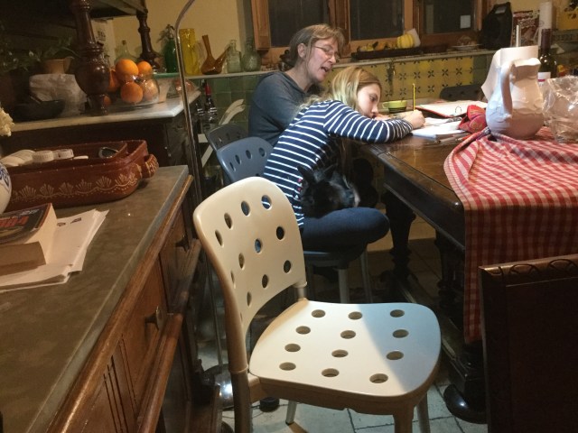 The homework load is high — a one-hour nightly confab between mother and daughter. George the patient bunny lends moral support!