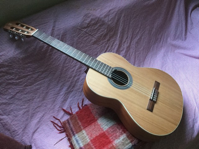 I bought this guitar new at a music store in Reus (Catalonia – Spain) for 260 euros. The brand is “Alhambra,” not one I was familiar with. Made in Spain. I must give it its due here and say that it’s an astoundingly fine instrument for the price. It’s well put-together and has a VERY light finish, almost raw — practically danced out of my clutch when I first played it — a surprisingly bright sound. I was told I could try out more expensive models of the line, but I said, naw, I’ll just take this one. I hadn’t wanted to lug a guitar with me to Spain — I’m just an amateur, anyway, but I try to abuse the best instrument I can afford as a general rule. My slogan is that mediocre players need good guitars more than good players do. I was shopping for a workaday guitar I could leave here pending my next visit so as to have my needs covered at both ends. This jewel does the trick. I almost wish I could take it home.