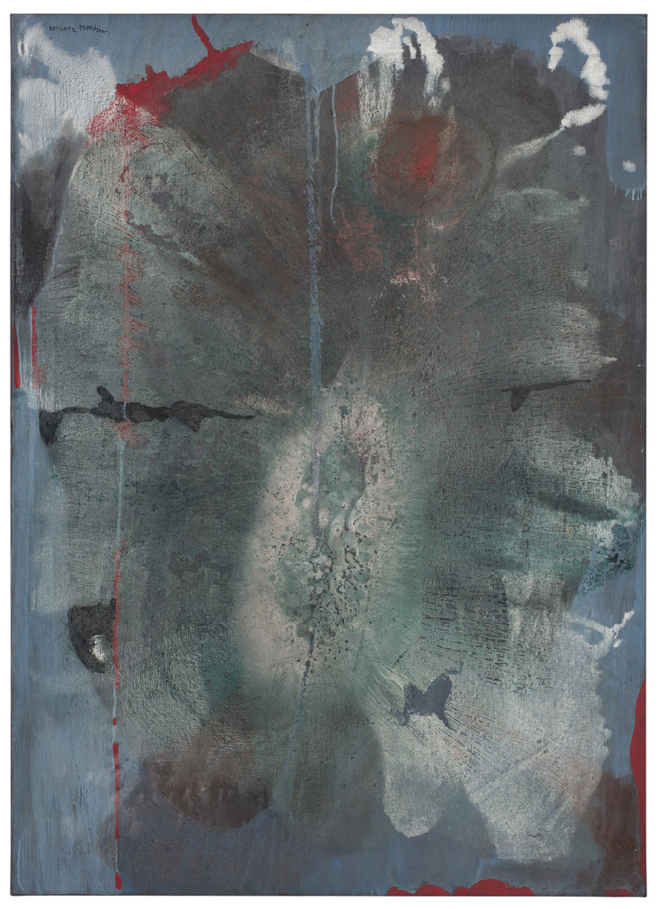 While most stain painting technique in the 1950s and early ’60s derived from Helen Frankenthaler’s innovative “Mountains and Sea,” of 1952, Bearden developed his approach on his own… studying informally with a calligrapher he knew only as Mr. Wu, who had a bookshop on Bayard Street. Mr. Wu showed Bearden the often more delicate techniques of Chinese ink painting which Bearden soon adapted to oil paint by thinning it with turpentine (which all stain painters did). This way of working provided a new ease by bringing Bearden, who had never liked the thickness of oil paint, close to one of his favorite mediums, watercolor.