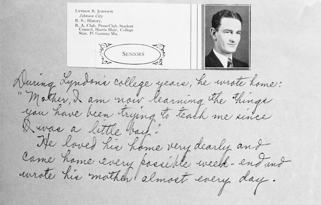 A page from Lyndon Johnson’s senior year college yearbook. Credit… Corbis, via Getty Images.