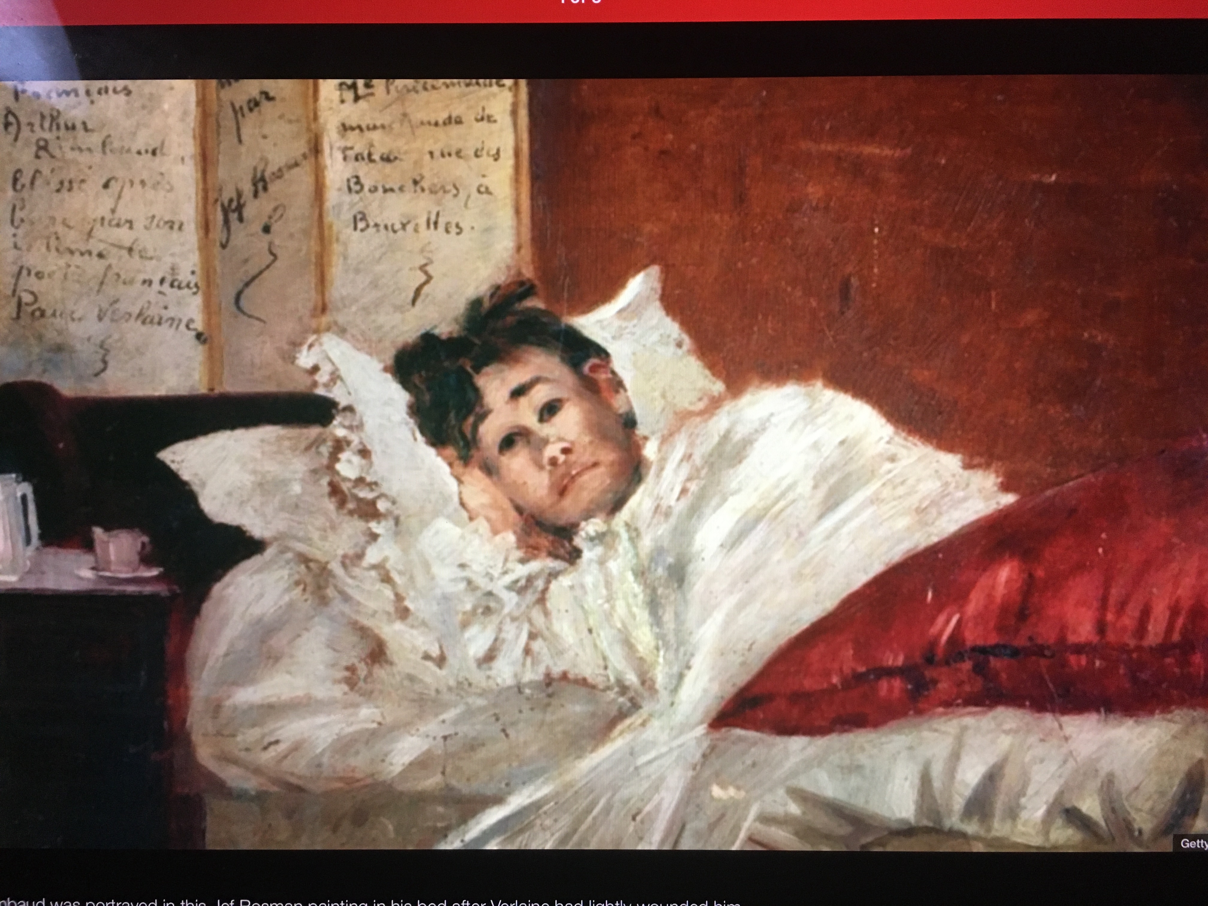 BBC. [Enid Starkie, in her book “Arthur Rimbaud” (1961), says this 1873 portrait of Rimbaud by the minor Belgian painter Jef Rosman, discovered by chance in 1947, is one of only two known likenesses of Rimbaud. The other is in the picture titled “Le Coin de Table” by Henri Fantin Latour (1872).]