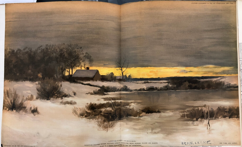 Louis Shadwick found that Bruce Crane’s “A Winter Sunset,” circa 1880s, in The Art Interchange magazine, was an almost perfect match for Hopper’s later teenage work, right down to the horizontal streak of light. Credit… Bruce Crane.