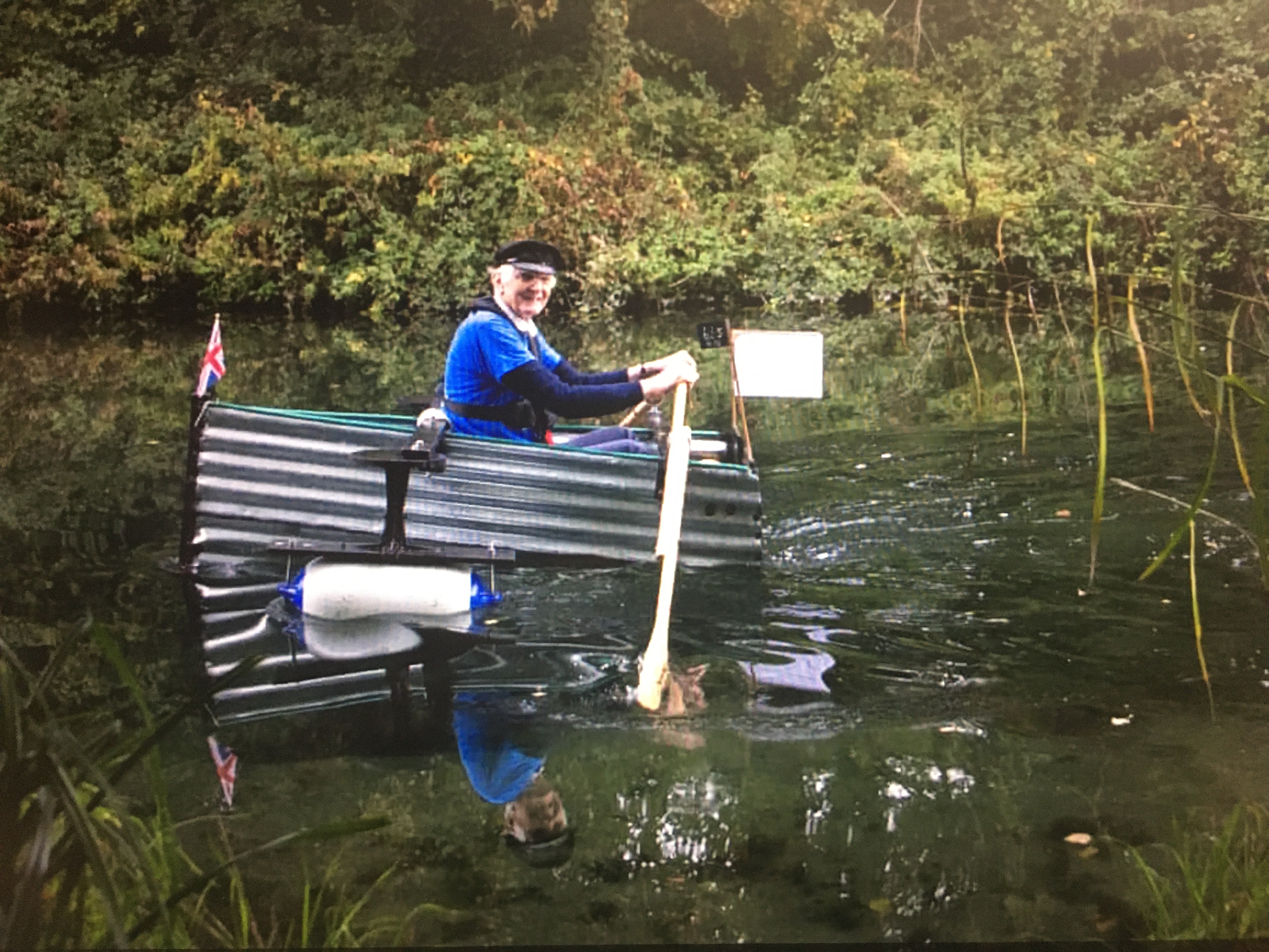 East Sussex, UK. Michael Stanley, 80, who is also known as ‘Major Mick’, rows along the Chichester canal in his homemade rowing boat, named the Tintanic. Stanley plans to row for 100 miles — rowing three miles at a time — to raise money for St Wilfrid’s Hospice in Bosham. Photograph: Andrew Matthews/PA.