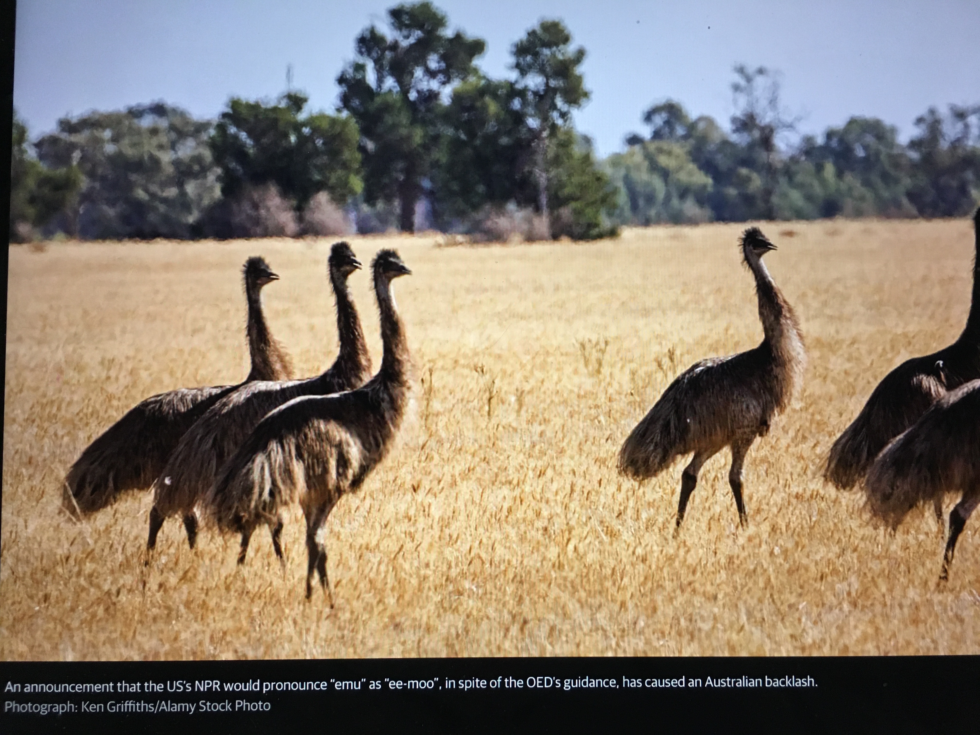 In August a Twitter-turd toss from Down Under landed on National Public Radio for pronouncing “emu” to rhyme with “poo” instead of “pew.”