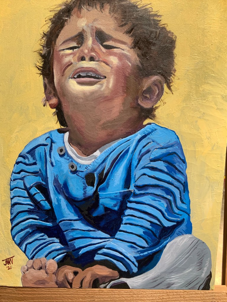 ‘Distraught Toddler,’ 16 x 20 in. oil on re-used canvas (JMN, 2021)