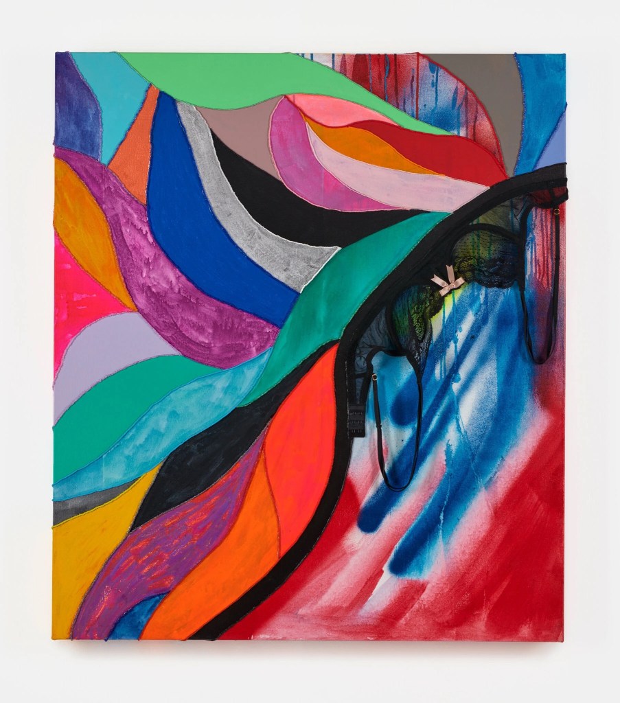 “Falling For You” (2021), acrylic, oil pastel, bra, beads and thread on canvas at Broadway Gallery. Credit…Sarah Cain and Broadway.