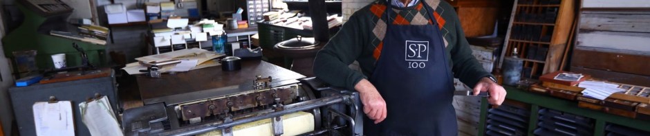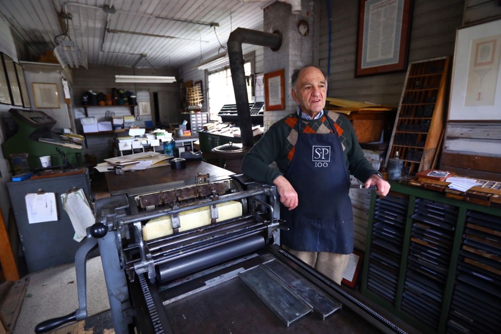 Independent publisher David Godine, shown with his press in his backyard barn, has sold his company and published the retrospective “Godine At Fifty.” PAT GREENHOUSE/GLOBE STAFF.