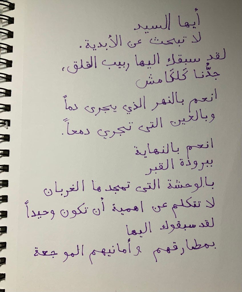 [bi-l-waḥšaẗi-l-latī tumjidu-hā-l-ḡirbānu]