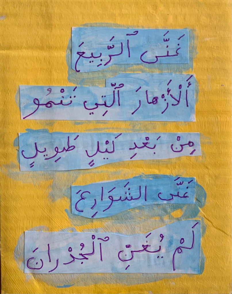 but he wouldn’t sing the hindering walls. [Inventive verging on Transgressive. The Arabic is starkly declarative and unconditioned preterite. The coordinating “but” is absent; in the translation it introduces a contrast.“Wouldn’t” lends a suggestion of rebellious intent, of refusal, a willful withholding of song by the singer. “Hindering” isn’t an exclusive trait of walls; they can also protect. It’s possible the epithet volunteered here becomes meaningful later in the poem. If so, is it fair for the translation to get ahead of things? If it doesn’t find subsequent validation, “hindering” seems all the more unsolicited.]