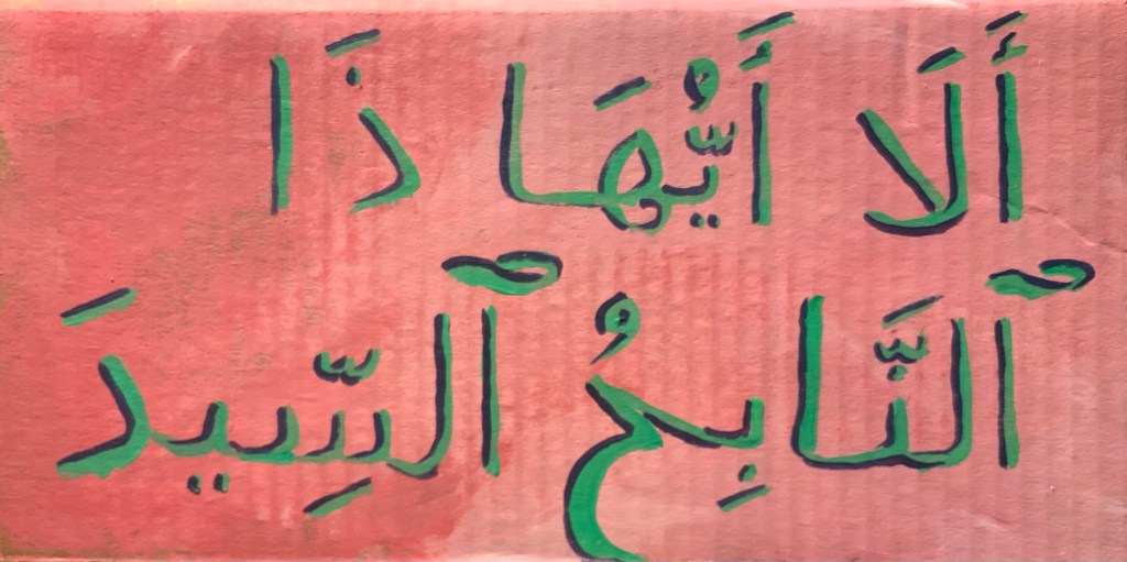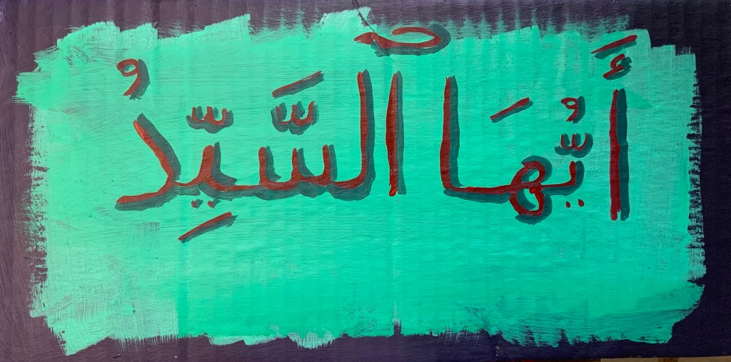 The vocative is a Hey, you, listen up! utterance involving a particle — ‘O’ in English, ‘ayyuhā in Arabic — followed by a noun or pronoun — here, sayyidun, master, sir, lord, chief. (3) Iskander leaves out the particle in its translation, perhaps from a desire not to sound mannered or highflown. However, sayyidun connotes prestige. It comports well with prefacing by “O.” The formal tone isn’t amiss contextually, and the source text is respected. Iskander’s translation could be tagged Omissive.