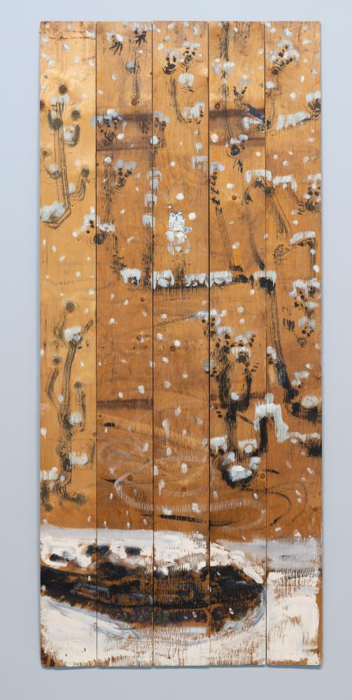 Old plywood, used planks, the top of a table pocked with woodworm: he found a way of painting on this hard and resistant substrate as if it were as light as parchment. And his brushwork, moreover, is rightly described as calligraphic. Owls, hawks, tangled blossoms, the pale discs of honesty seeds hanging like silver moons from skeletal black boughs: his art has all the delicacy of nature, combined with a swirling, stuttering, sometimes wayward abruptness.