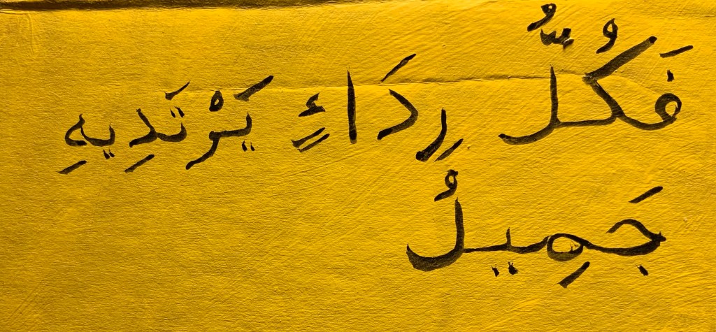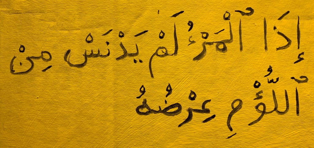 ‘iḏā-l-mar’u lam yadnas mina-l-lu’mi ^irḏu-hu When the man [‘iḏā-l-mar’u] was not soiled [lam yadnas] from baseness [mina-l-lu’mi] his honor [^irḏu-hu]…fa-kullu ridā’in yartadī-hi jamīlu … then every garment [fa-kullu ridā’in] he puts it on [yartadī-hi] beautiful [jamīlu].