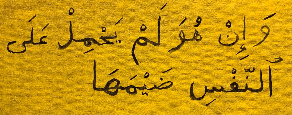 wa-‘in huwa lam yaḥmil ^alaA-n-nafs(i) ḍaim(a)-ha And if he [wa-‘in huwa] did not carry (has not carried) [lam yaḥmil] upon the (his) soul (self) [^alaA-n-nafs(i)] its injury [ḍaim(a)-hā]…fa-laisa ‘ilA ḥusn(i)-ṯ-ṯanā’(i) sabīl(u) … then there is not [fa-laisa] to the goodness of praise [‘ilA ḥusn(i)-ṯ-ṯanā’(i)] a way [sabīlu].