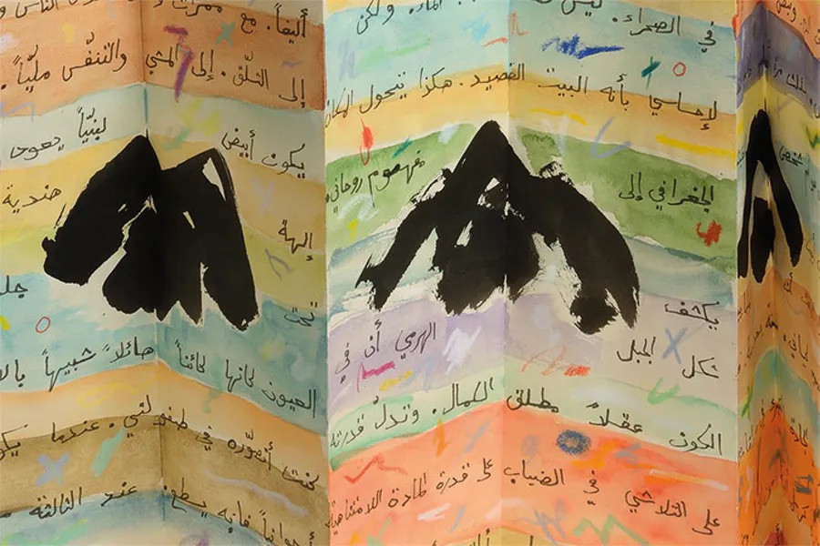 Perhaps most interesting, in terms of her parallel practices of art and writing, is the display’s focus on what she refers to as ‘leporellos’ – a term for a sort of pleat-folded, concertina-style book, typically many pages long. It’s a format she began experimenting with while living in California, after coming across leporellos in a Japanese store there… “The guy in the shop told me it was for putting photographs in! But when I saw it, I knew that what I wanted to do was write Arab poetry.”