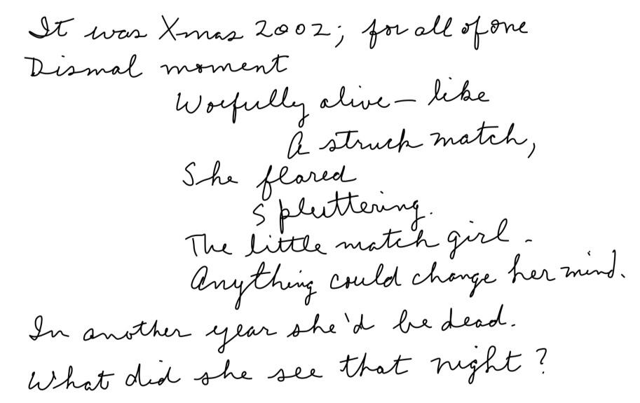 The lady who glitches outside the restaurant is 83 years old. Time’s wingèd chariot tailgates her. The flare and sputter of the match is a glowing emblem for the outburst pondered in the poem: an access of rage at decline, possibly of ambivalence and exasperation over the impudent vitality of progeny. The phrase woefully alive stamps her dismal moment.