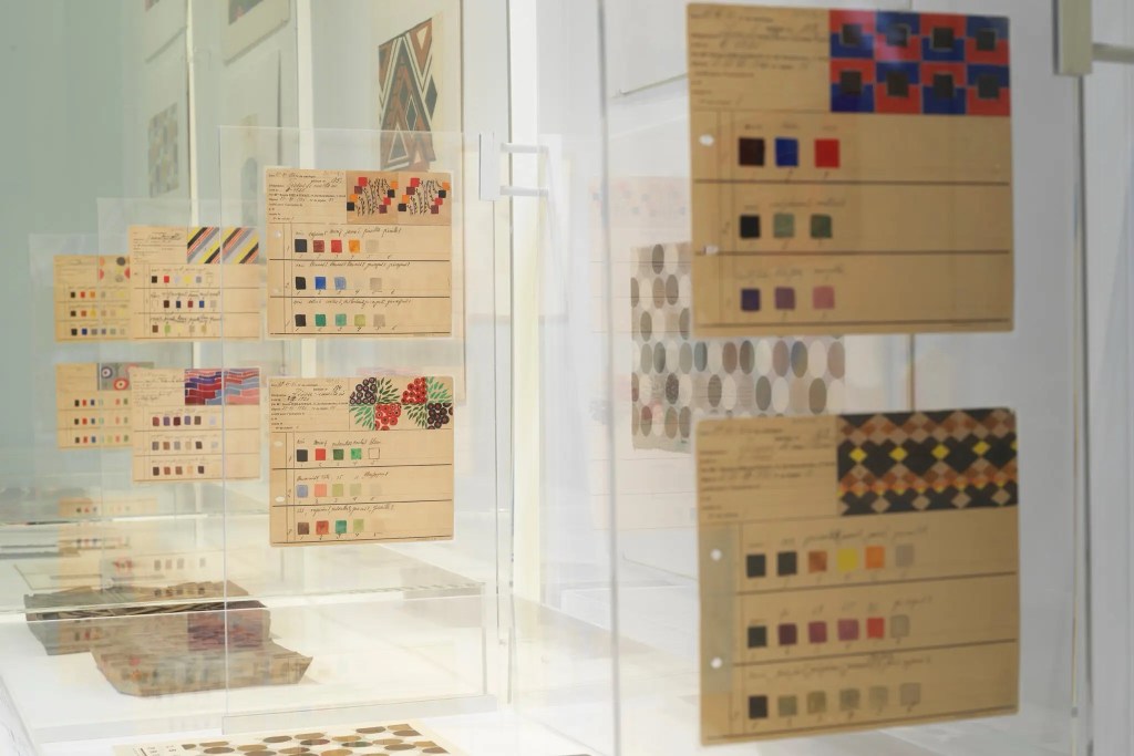 Floated in glass dividers between the swatches are Sonia’s instructional “color cards” to the fabric manufacturer. Exacting and propulsive, these colorways show that she understood the kinships and rivalries of hue with a shrewdly marketable instinct.