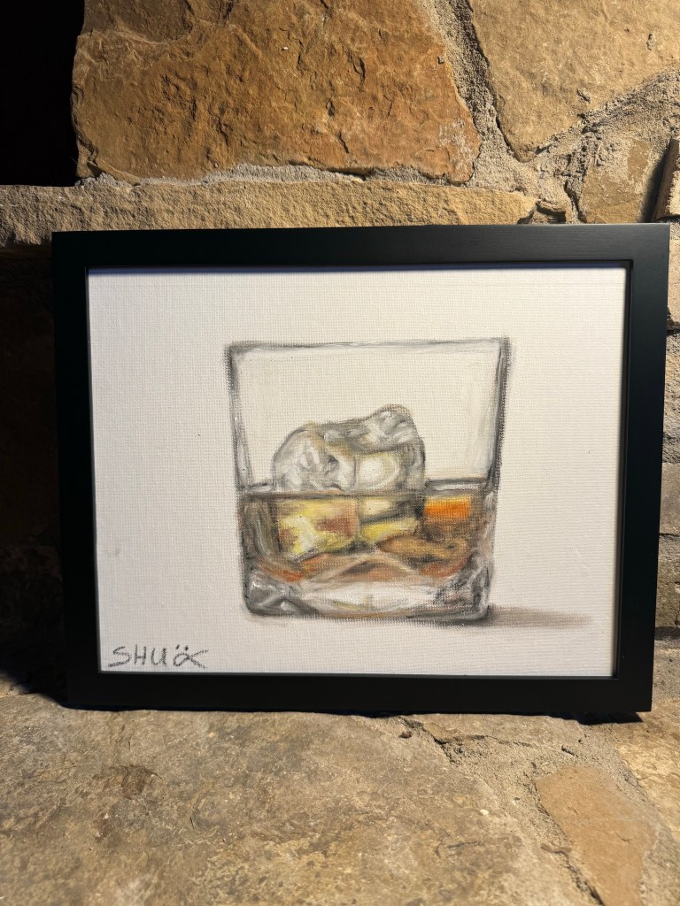 “Joshua’s Sketch,” oil pastel on canvas board, 11 x 14 in. (2024). Joshua, a friend, took a shine to my portrait of Eli Wallach in the role of a menacing outlaw. He proposed a swap, and I took him up: his whiskey for my Eli. Joshua has a penchant for hyper-realistic rendering of unconventional subjects. I admire this vein of painting for the attention to nuanced values and disciplined media handling it exacts. Joshua liked the sheen I captured on Eli’s weapon. The picture is from my period of trying to understand Hollywood and guns. It’s titled “Go Ahead, Make My Tea.”