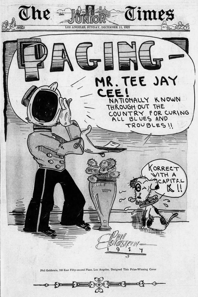 [Guston] joined a youth organization that produced The Junior Times, a Sunday supplement in The Los Angeles Times for essays, poems, puzzles and illustrations by kids, for kids. From 1925 to 1929, in these pages, Guston honed his pen for an audience of the West Coast’s largest home delivery.