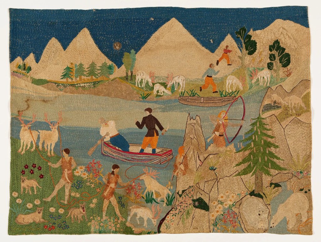 Marguerite Sirvins, “Landscape With Boats, Hunters, and Animals,” circa 1944-1955, rayon thread embroidered on fabric. Credit… Musée LaM. [New York Times caption and illustration]