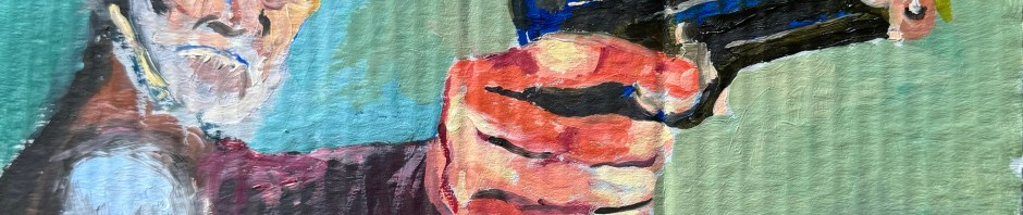 “Big Pistol Sticking Out of the Hand of a Grizzled Geezer,” oil on cardboard, 7 x 12 in. (JMN 2024).