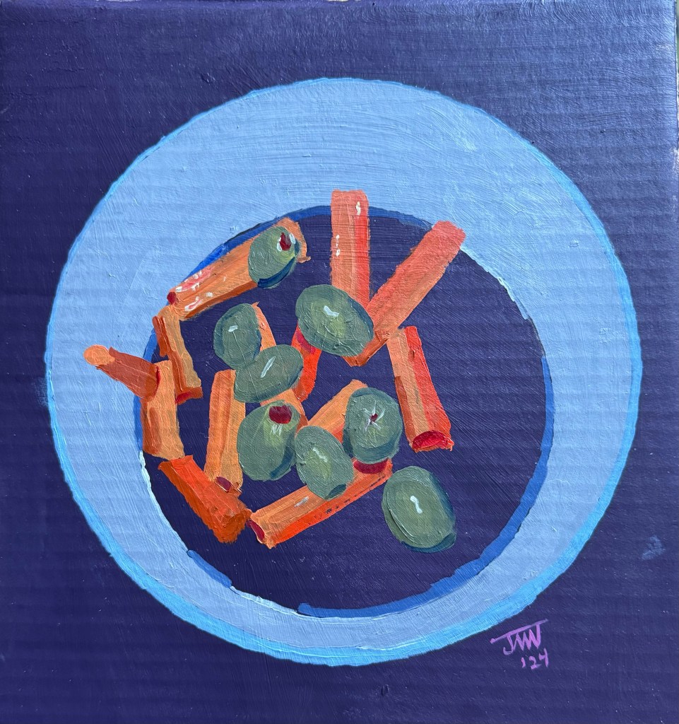 “Aerial View of Crudités Wreckage,” oil on cardboard, 10 x 11 in. (JMN 2024).