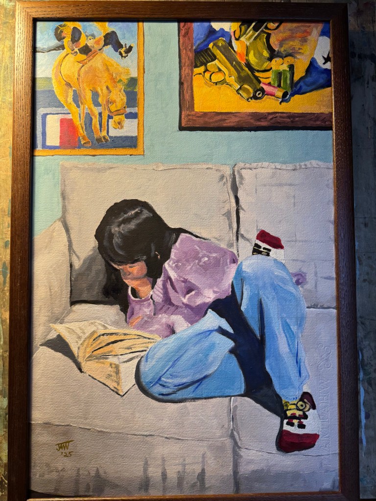 “Figure Reading a Book,” oil on paper, 16 x 25 in. (JMN 2025).