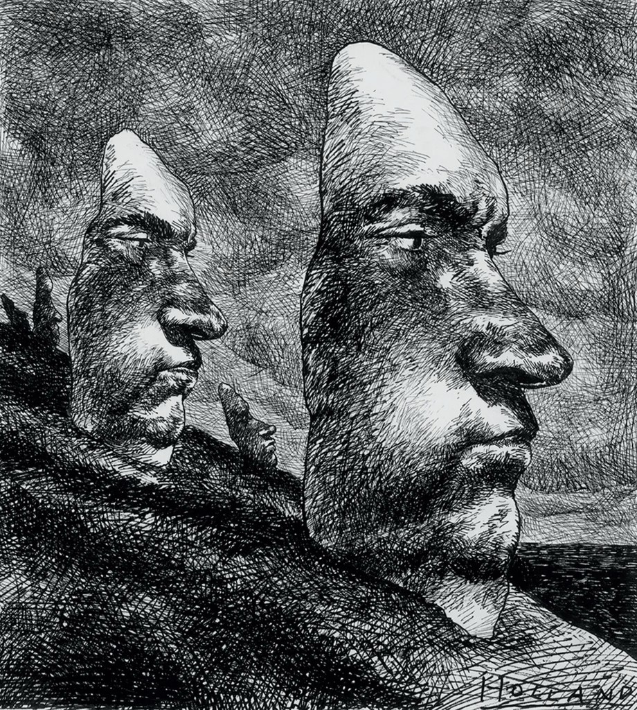 “Outcast” (1974) was one of many images of Richard M. Nixon that Mr. Holland created for The Times. Credit… Brad Holland/Artists Rights Society (ARS), New York. [New York Times caption and illustration]