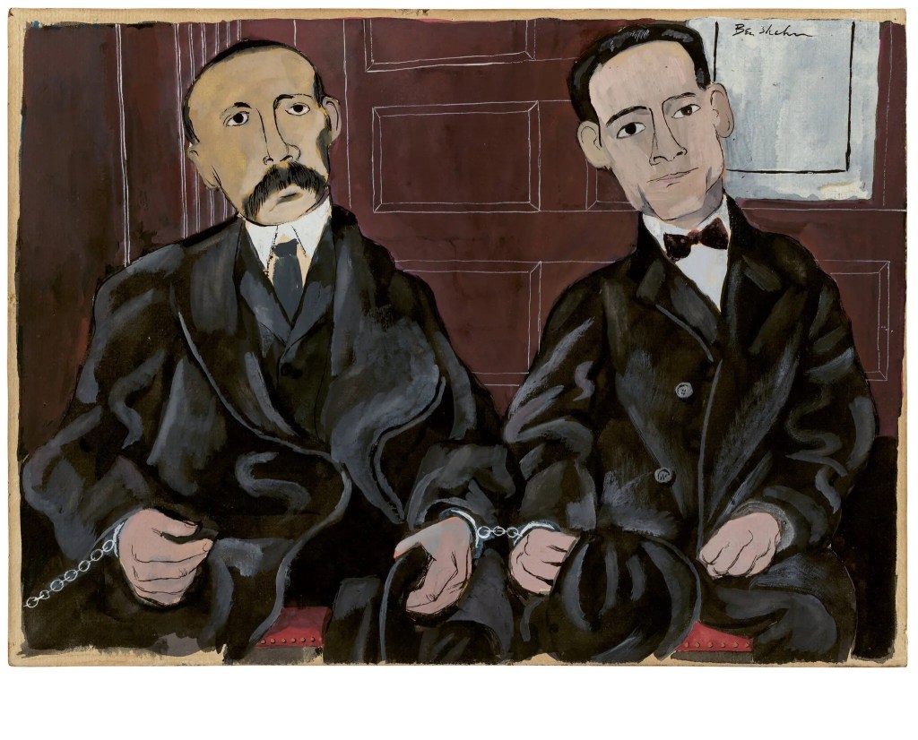 A 1923 news photograph showing Bartolomeo Vanzetti (left) handcuffed to Nicola Sacco, in a courthouse in Dedham, Mass. Shahn used it as his source for a painting in the Jewish Museum show. Credit… via Boston Public Library. [New York Times caption and illustration]