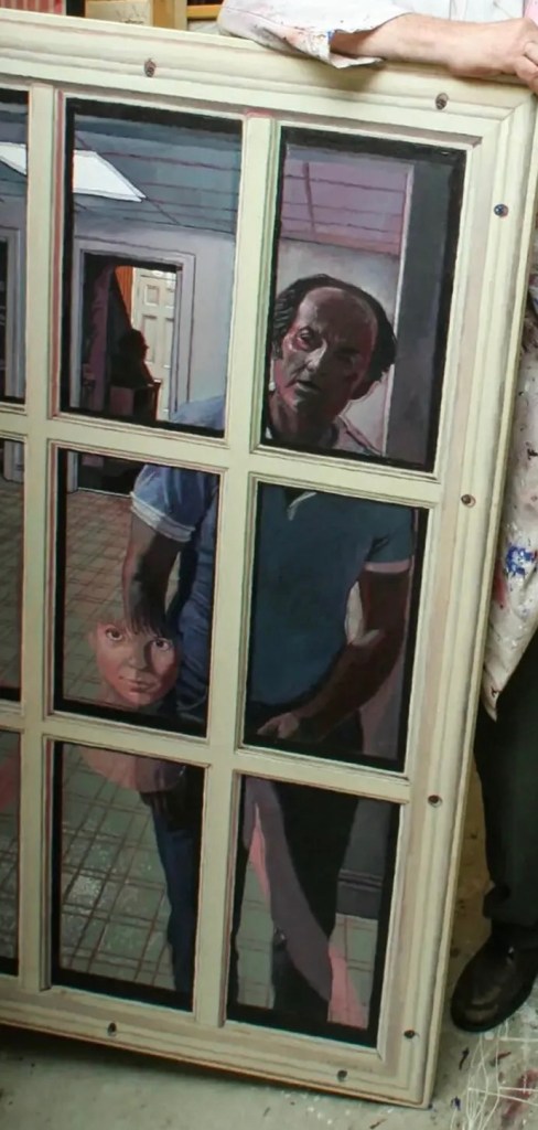 [Detail] Mr. Leipzig in 2010 in his home studio with his painting “Francesca at the Door,” depicting his younger self and his daughter. Credit… Susan Smith & Gallery Henoch. [New York Times caption and illustration]