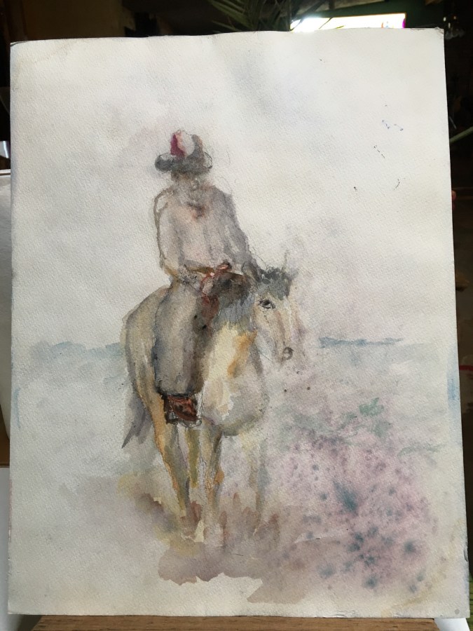 HJN0012 Solitary Horseman, Watercolor, Side 2. 11-3/4 x 15-1/4 in. Copyright 2018 James Mansfield Nichols. All rights reserved.