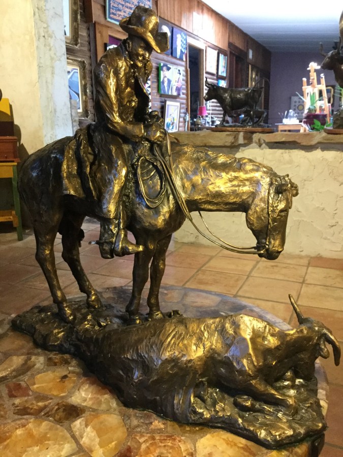 Rancher and Sick Cow (1), HJN. Bronze, 20″H x 22″L. One of one. $20,000. Copyright 2018 James Mansfield Nichols. All rights reserved.