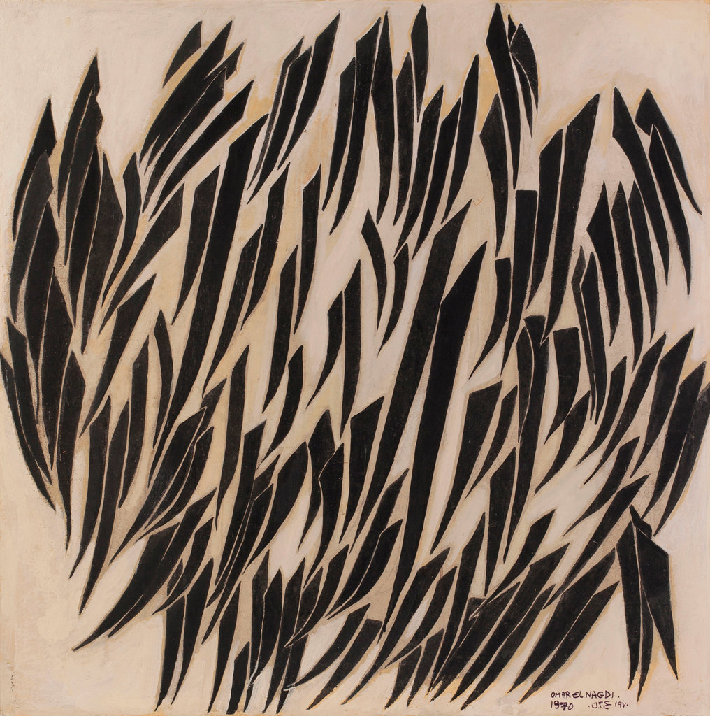 An untitled piece by the Egyptian artist Omar el-Nagdi from 1970 shares its form with the first letter of the Arabic alphabet. Credit… Barjeel Art Foundation.