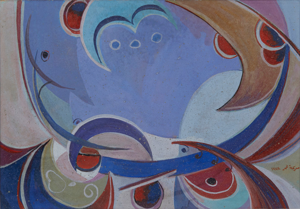 An untitled 1978 watercolor by Madiha Umar recalls Arabic letter forms as well as ancient Mesopotamian crescent moons. Credit… Barjeel Art Foundation.