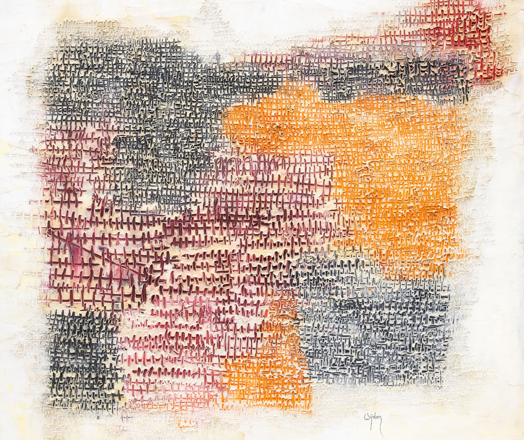 An untitled oil by Wijdan from 1970. “Each little dash, like a letter, insists on its granular distinctness, whatever their overall effect,” our critic says. Credit… Barjeel Art Foundation.